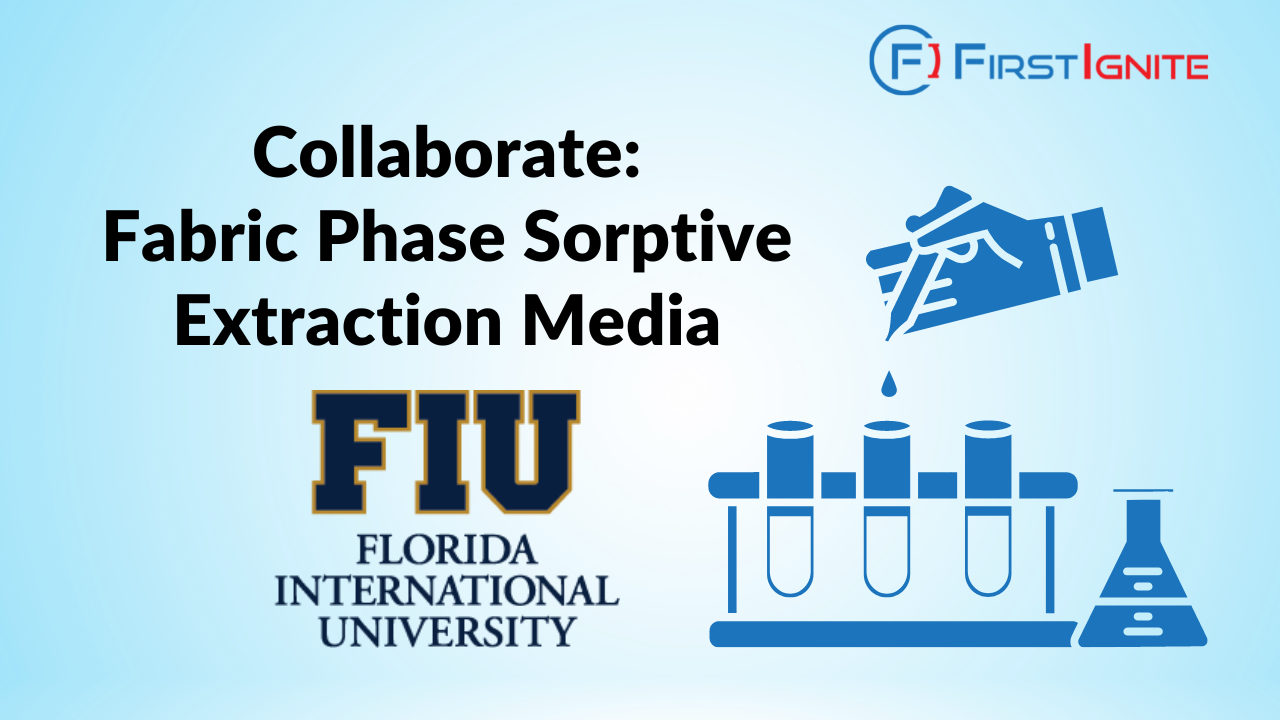 FirstIgnite is supporting the commercialization of Florida International University’s new fabric phase sorptive extraction (FPSE) media technology. This media is used for analyzing trace and ultra-trace levels of organic analytes in various sample matrices. Its benefits include the ability to sample and prepare analytes without matrix modification or pre-treatment, flexibility for sampling and testing in different environments, specificity for various analytes due to the availability of a wide range of sorbent chemistries, and part per quadrillion (ppq) level sensitivity for both polar and medium polar analytes.