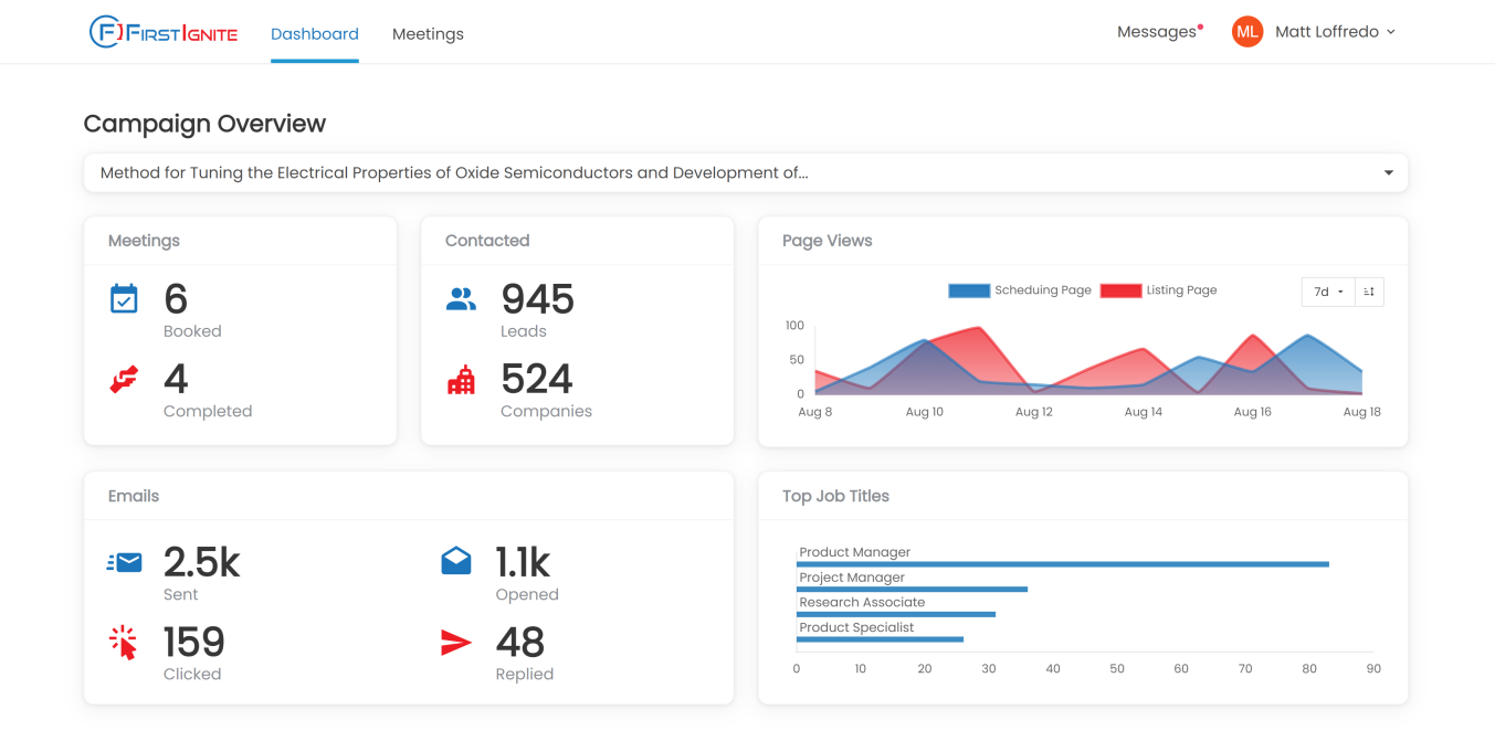 We’re excited to announce our newest feature to the FirstIgnite platform: a campaign data dashboard that consolidates all of your most relevant campaign statistics in one place. You can now receive real-time access to all marketing and meeting activity happening within your campaign. This includes email activity, the companies and leads contacted on your behalf, and various marketing page view statistics.